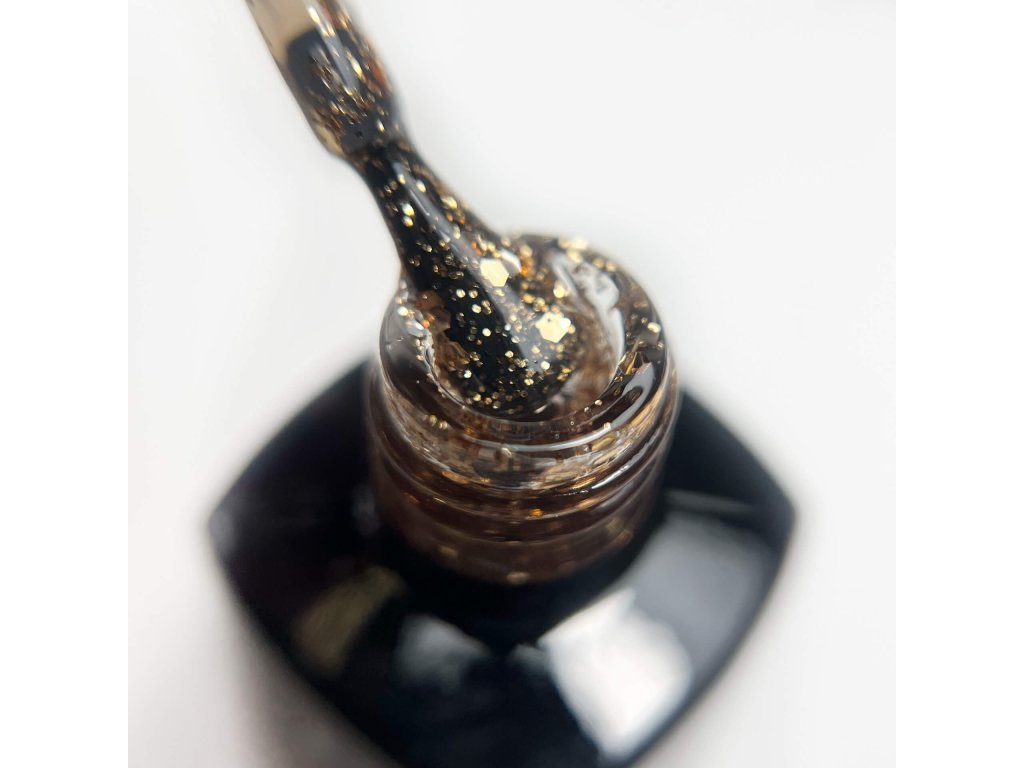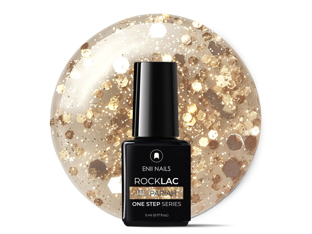 ROCKLAC č.111 transparentný so zlatými glitrami je one stepový, bezvýpotkový lak, ktorý sa vytvrdzuje v UV / LED lampe.